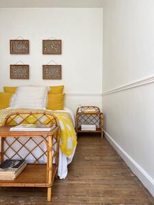 Paire de chaises en rotin tressé. Naturel et rouge bordeaux. Vers 1920. Largeur 41 cm. Profondeur 48 cm. Hauteur assise 46 cm. Hauteur dossier 82 cm.